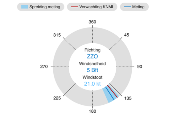 A particularly nice development is the visualization of wave forecasts, which replaces an old Java applet. The first element is a map of the North Sea, with a layer for wave height and observation locations where more information is available. By clicking on such a location, the user can open a panel with the following graphs: a polar graph showing the energy density against the direction and wave frequency; a wave spectrum; and a table with the most important characteristics. The first graph nicely illustrates that waves (high frequencies) and swell (low frequencies) might move in different directions.