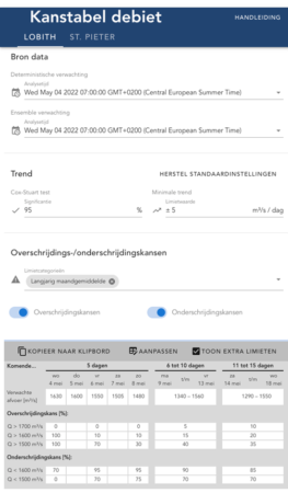 A nice example of this is the tool for building the probability table. This table is an overview of the probability that the flow in the river at Lobith exceeds a certain level. The probability is based on a forecast plume: a large number of forecasts with slightly different settings. This plume shows the variance in the forecasts. The trend is also shown in the table: whether the flow rate is increasing or decreasing. Before, the WMCN advisors determined the trend by just looking at the data. Now, a statistical test, the Cox-Stuart test, is used. By setting a minimum value, the user can specify when the trend is considered to be significant.